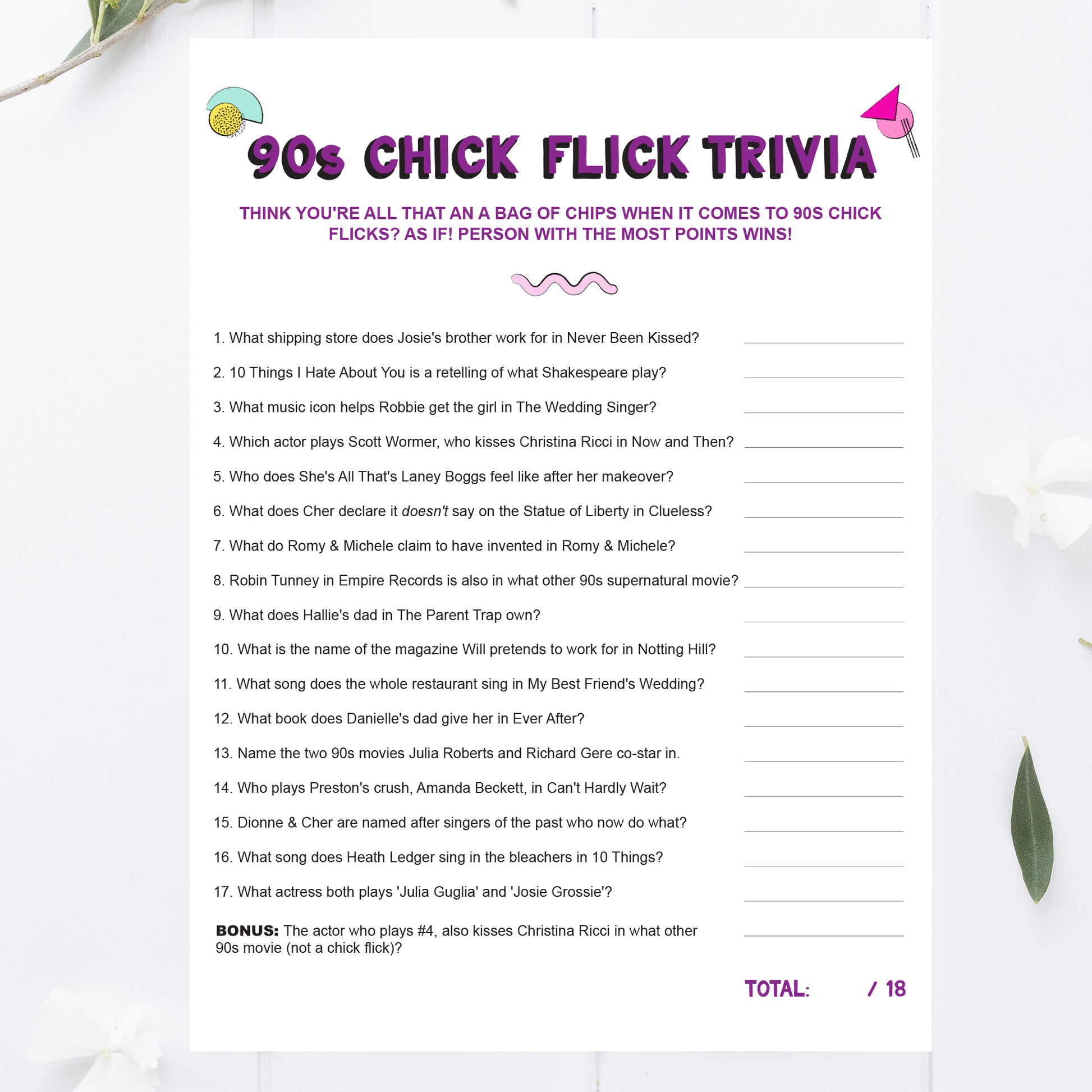 Hosting a 90s themed party? This 90s chick flick trivia game printable is the perfect way to test your guests' knowledge of everything 90s! Simply download and print from home or your local print shop!