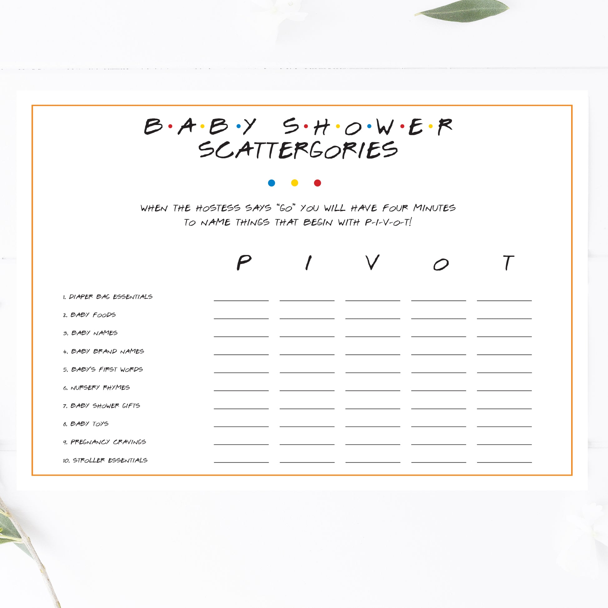 * One Friends Baby Shower Scattergories game printable (one 8.5x11" PDF)